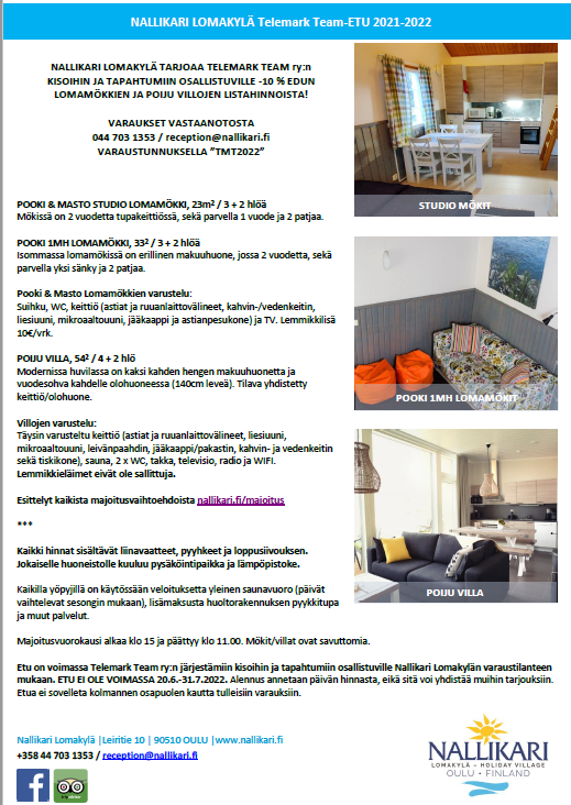 NALLIKARI LOMAKYLÄ TARJOAA TELEMARK TEAM ry:n KISOIHIN JA TAPAHTUMIIN OSALLISTUVILLE -10 % EDUN LOMAMÖKKIEN JA POIJU VILLOJEN LISTAHINNOISTA!