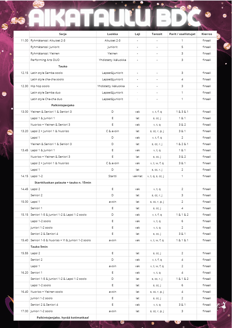 Starttiluokat - ILMOITTAUTUMINEN: https://forms.office.com/e/4yBziUFrRF Lapsi 1-2 parit Lapsi 1-2 soolo Juniori 1-2 parit Juniori 1-2- soolo Nuoriso + yleinen parit Nuoriso + yleinen soolo Seniori 1-2 parit Seniori 1-2 soolo Seniori 3-5 parit Seniori 3-5 soolo Starttiluokkien ohjeistus löytyy täältä: https://www.dancesport.fi/wp-content/uploads/2025/01/STUL_Liite-1-Starttiluokat-ja-lasten-avoimet-lu...
